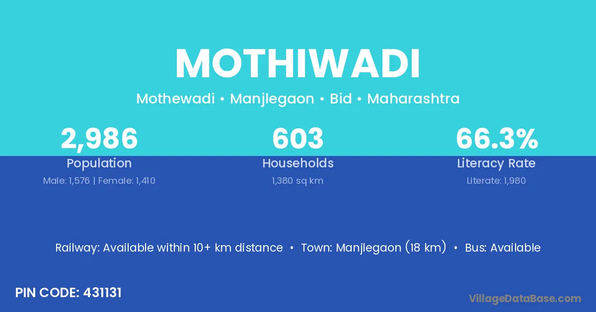 Manjlegaon (18 km) is the nearest town to Mothiwadi village for major economic activities and is located approximately 18 km away.