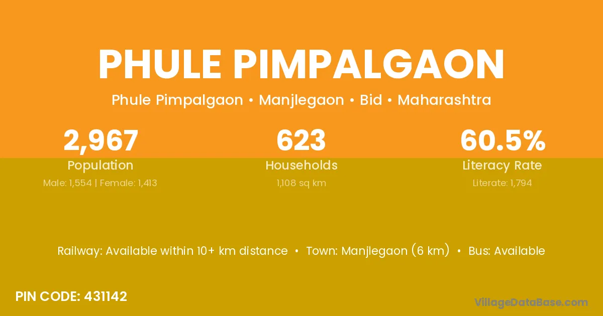 Phule Pimpalgaon village has a total population of 2,967 people, of which 1,554 are males and 1,413 are females.
