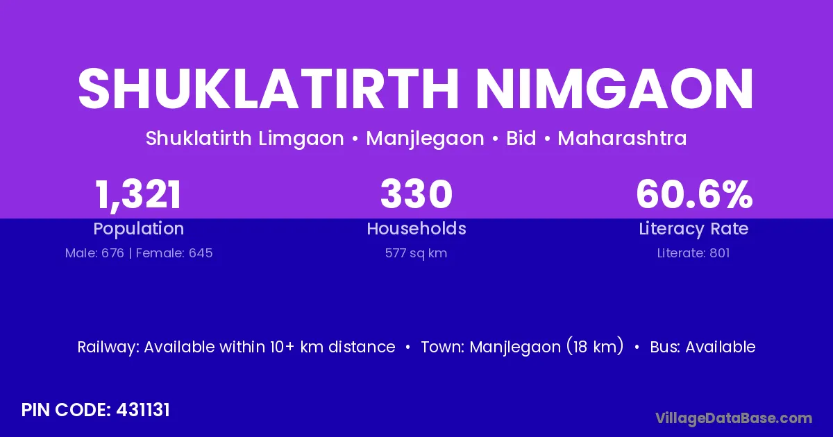 Manjlegaon (18 km) is the nearest town to Shuklatirth Nimgaon village for major economic activities and is located approximately 18 km away.