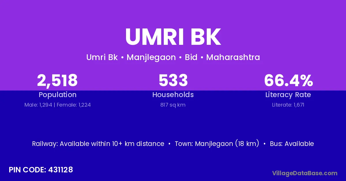 Manjlegaon (18 km) is the nearest town to Umri Bk village for major economic activities and is located approximately 18 km away.