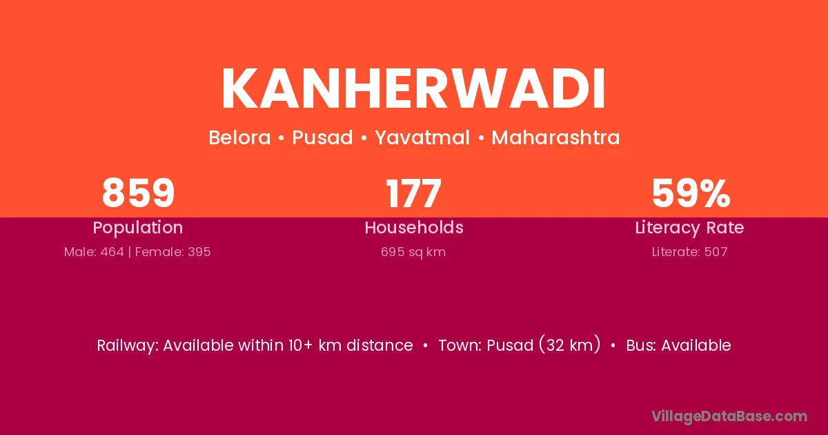 The literacy rate of Kanherwadi village is 66.31%. Male literacy stands at 73.26% and female literacy at 58.52%.