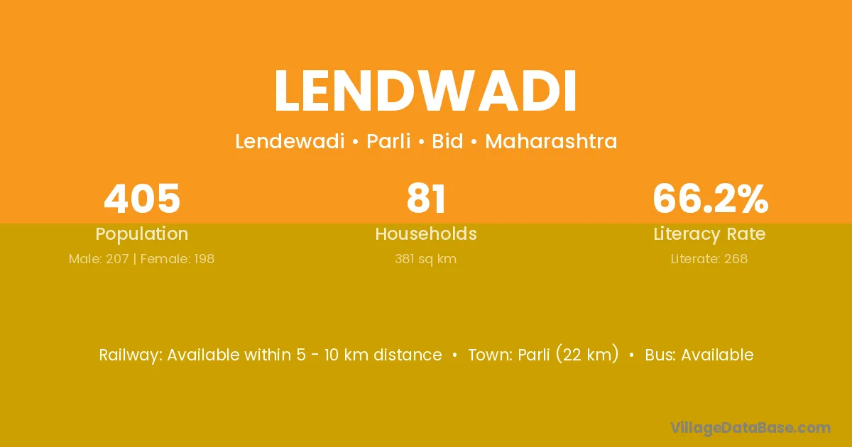 Parli (22 km) is the nearest town to Lendwadi village for major economic activities and is located approximately 22 km away.