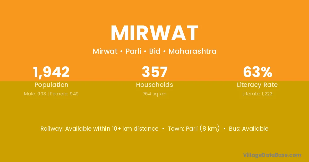 Parli (8 km) is the nearest town to Mirwat village for major economic activities and is located approximately 8 km away.