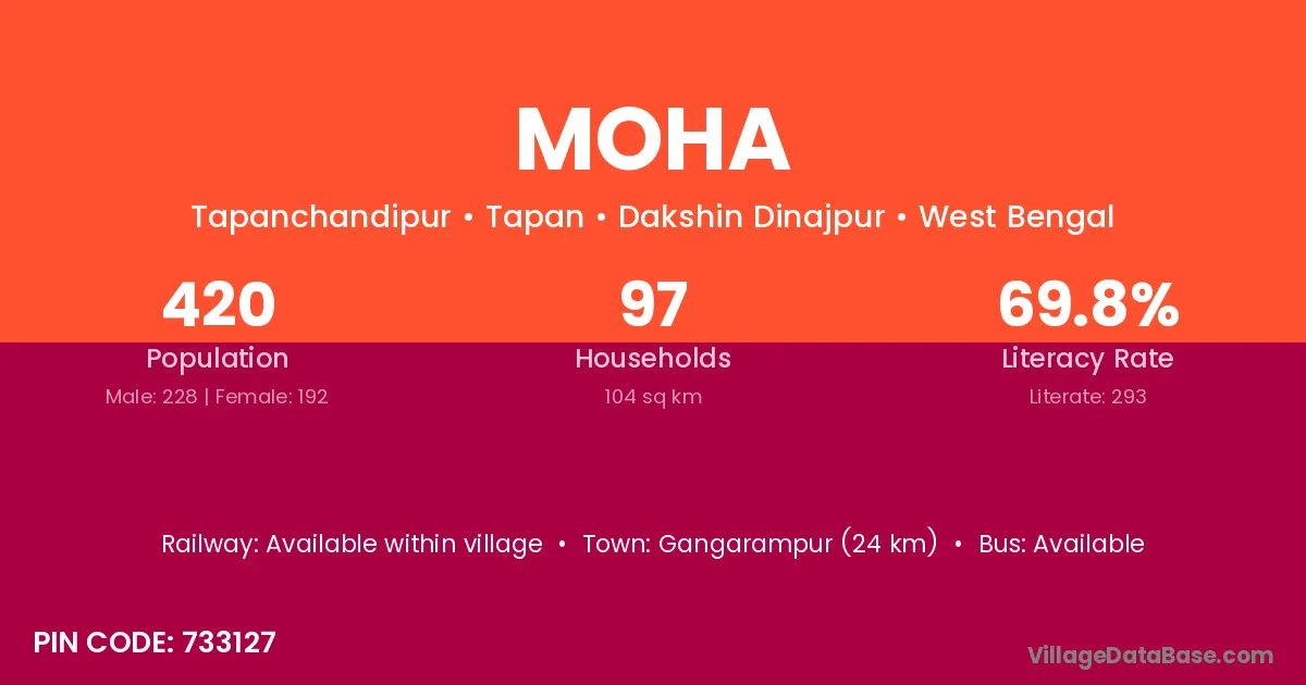 The literacy rate of Moha village is 67.83%. Male literacy stands at 73.68% and female literacy at 61.54%.
