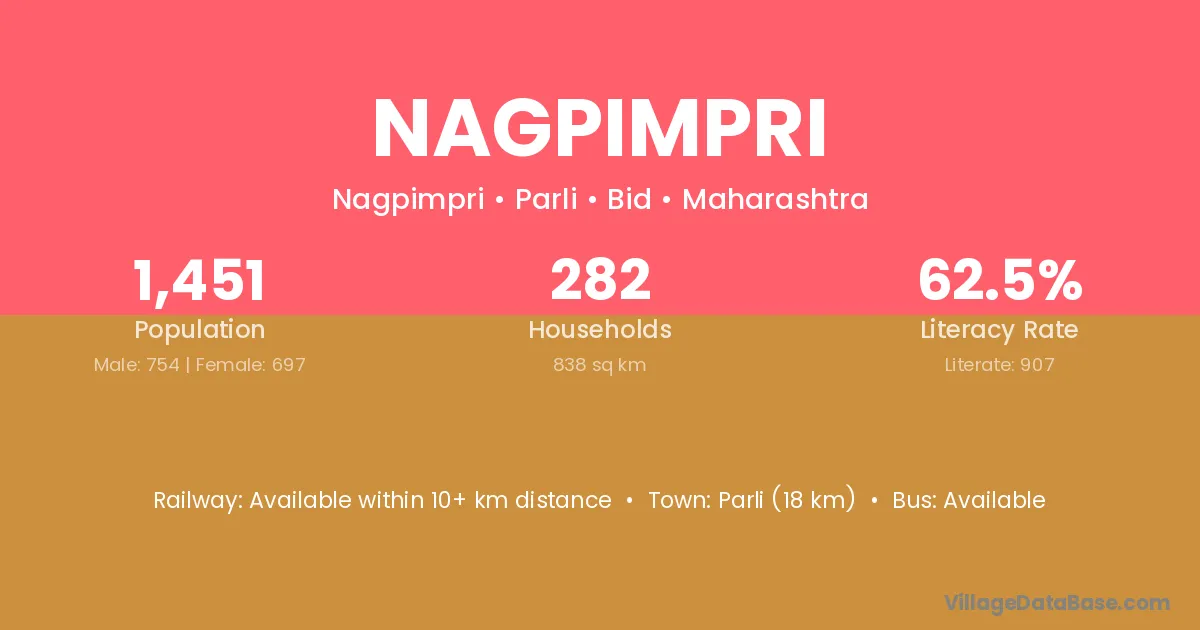 Parli (18 km) is the nearest town to Nagpimpri village for major economic activities and is located approximately 18 km away.