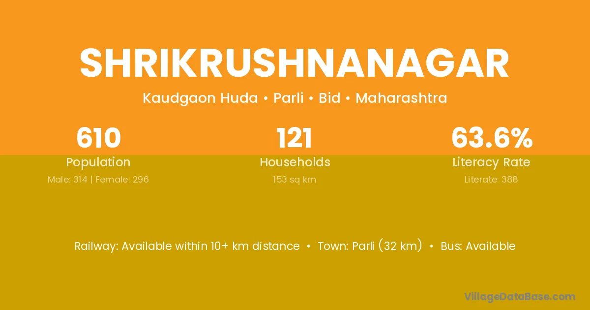 Parli (32 km) is the nearest town to Shrikrushnanagar village for major economic activities and is located approximately 32 km away.