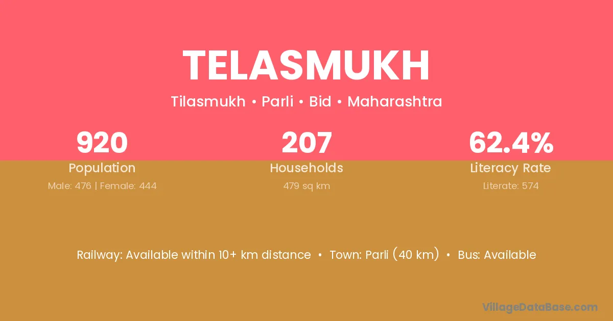 Parli (40 km) is the nearest town to Telasmukh village for major economic activities and is located approximately 40 km away.
