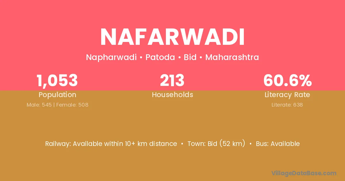 Bid (52 km) is the nearest town to Nafarwadi village for major economic activities and is located approximately 52 km away.