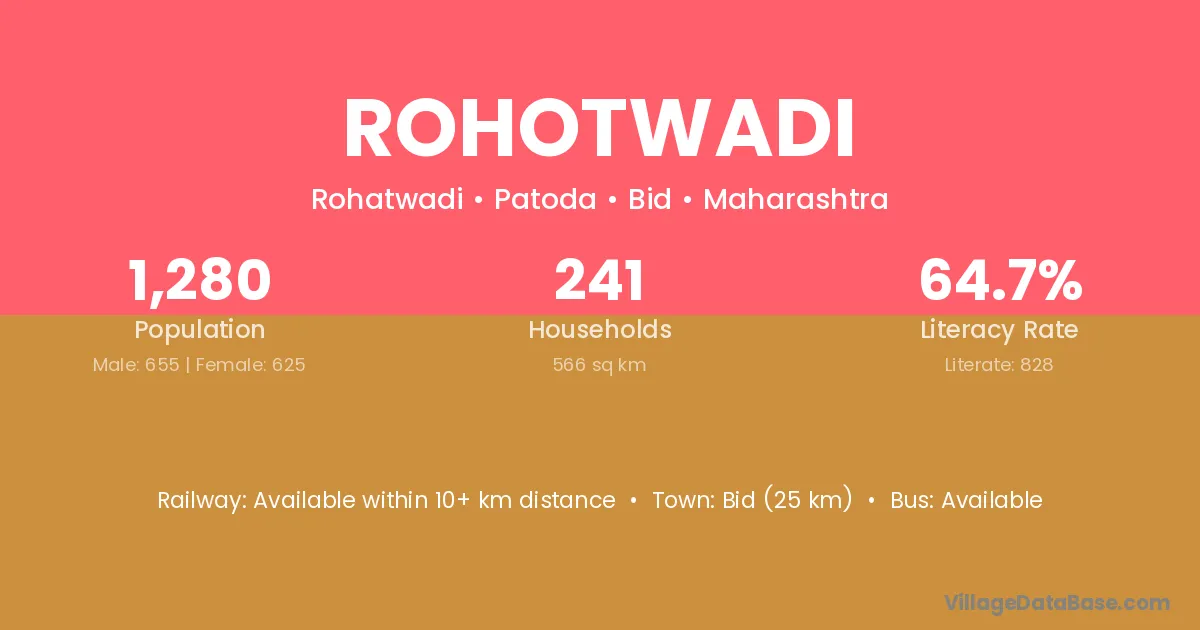 Rohotwadi village has a total population of 1,280 people, of which 655 are males and 625 are females.