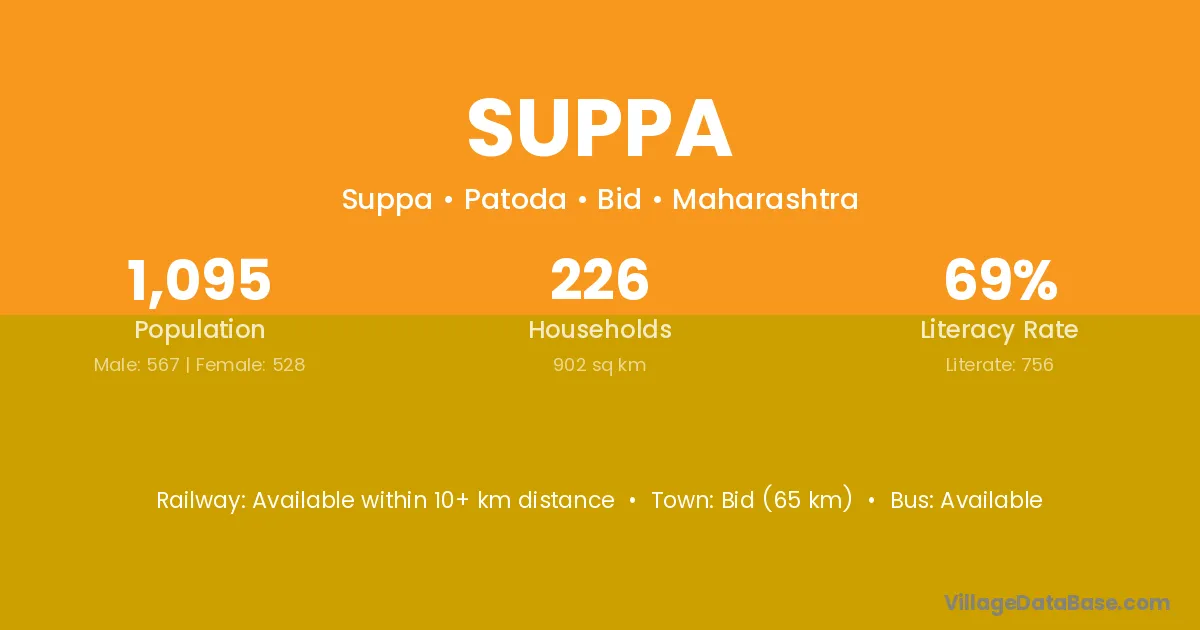 Bid (65 km) is the nearest town to Suppa village for major economic activities and is located approximately 65 km away.
