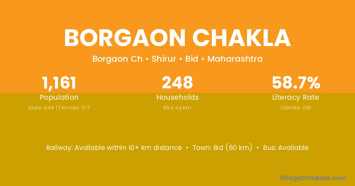 Bid (60 km) is the nearest town to Borgaon Chakla village for major economic activities and is located approximately 60 km away.