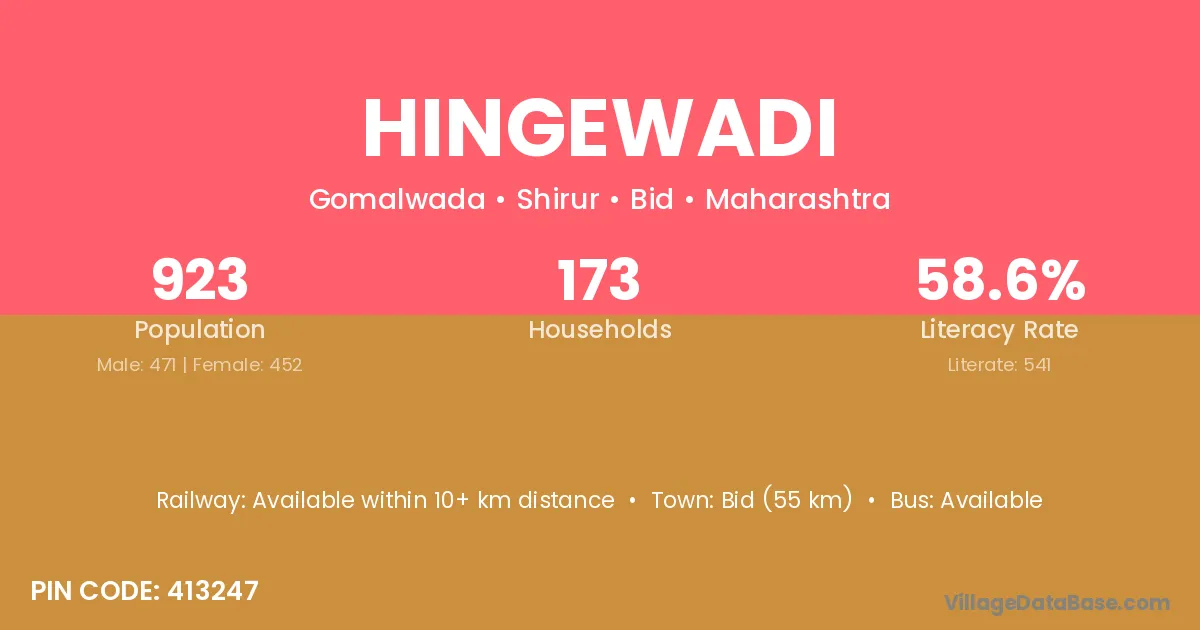 Bid (55 km) is the nearest town to Hingewadi village for major economic activities and is located approximately 55 km away.