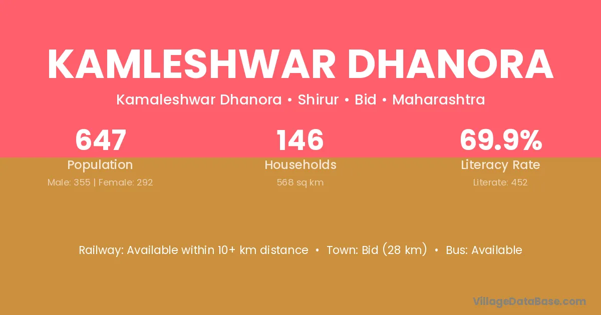 Bid (28 km) is the nearest town to Kamleshwar Dhanora village for major economic activities and is located approximately 28 km away.