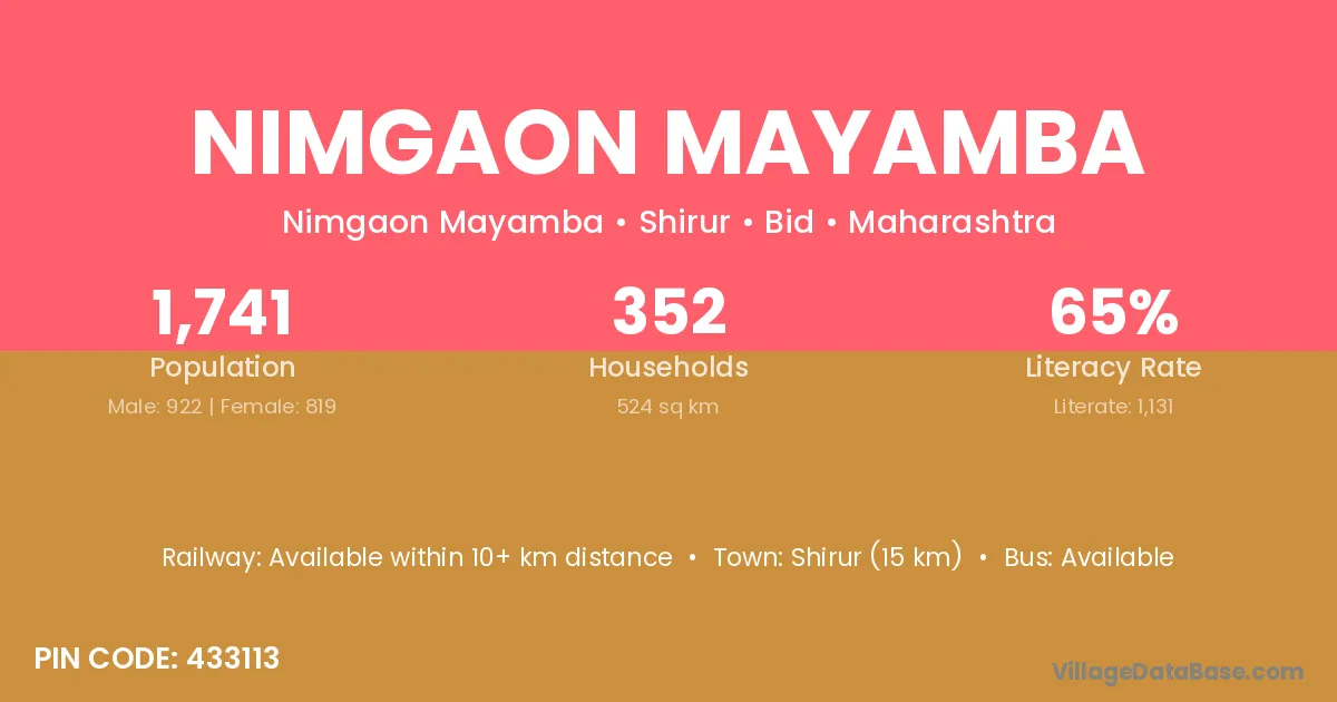 Nimgaon Mayamba village has a total population of 1,741 people, of which 922 are males and 819 are females.