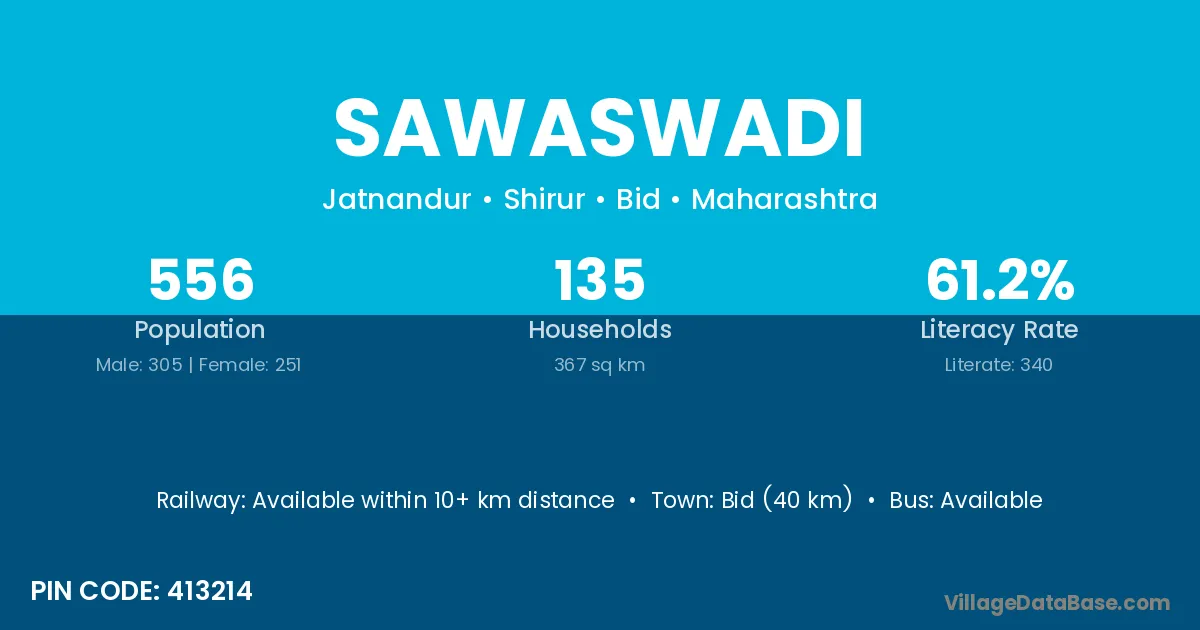 Bid (40 km) is the nearest town to Sawaswadi village for major economic activities and is located approximately 40 km away.