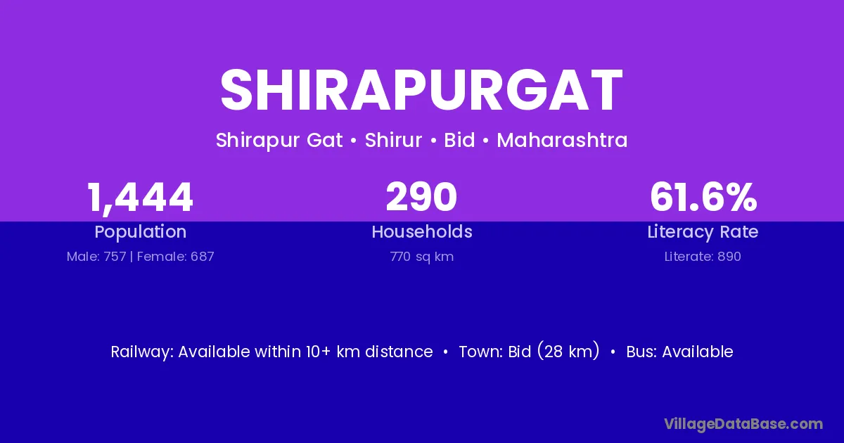 Shirapurgat village has a total population of 1,444 people, of which 757 are males and 687 are females.