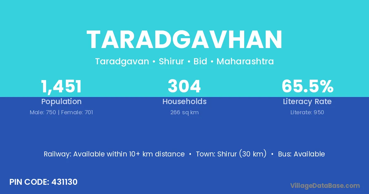 Shirur (30 km) is the nearest town to Taradgavhan village for major economic activities and is located approximately 30 km away.