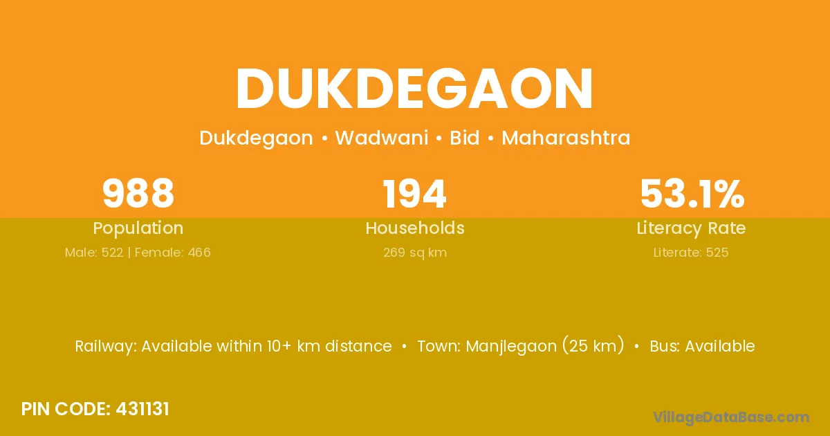Manjlegaon (25 km) is the nearest town to Dukdegaon village for major economic activities and is located approximately 25 km away.