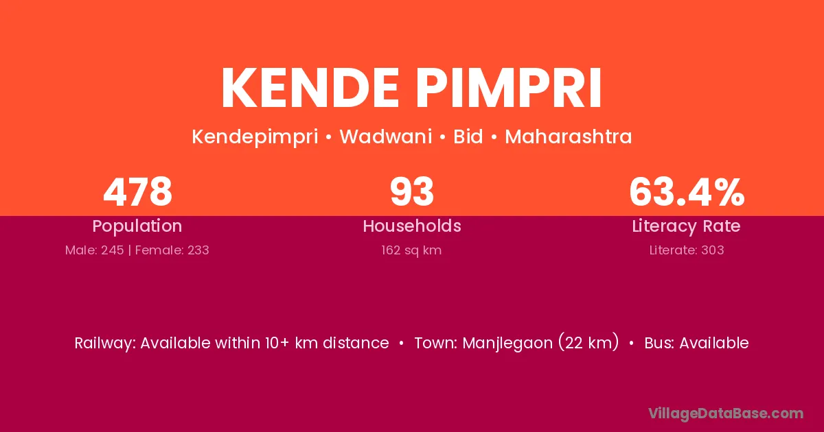 Manjlegaon (22 km) is the nearest town to Kende Pimpri village for major economic activities and is located approximately 22 km away.