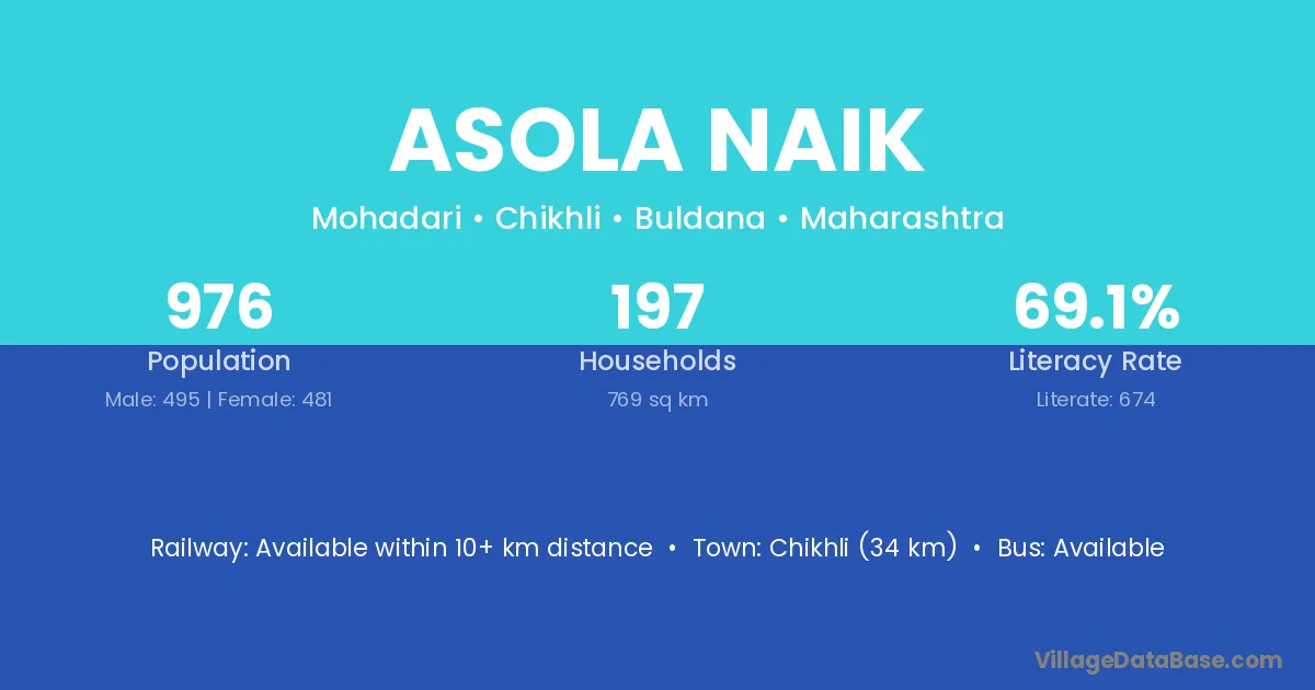 Chikhli (34 km) is the nearest town to Asola Naik village for major economic activities and is located approximately 34 km away.