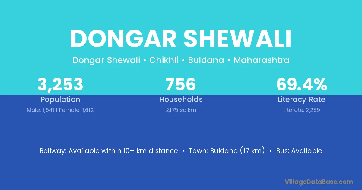 Buldana (17 km) is the nearest town to Dongar Shewali village for major economic activities and is located approximately 17 km away.