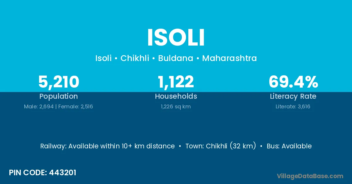 Chikhli (32 km) is the nearest town to Isoli village for major economic activities and is located approximately 32 km away.