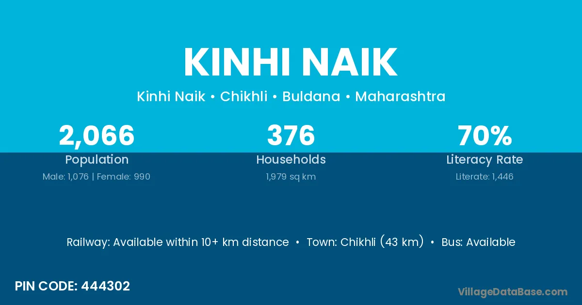 Chikhli (43 km) is the nearest town to Kinhi Naik village for major economic activities and is located approximately 43 km away.
