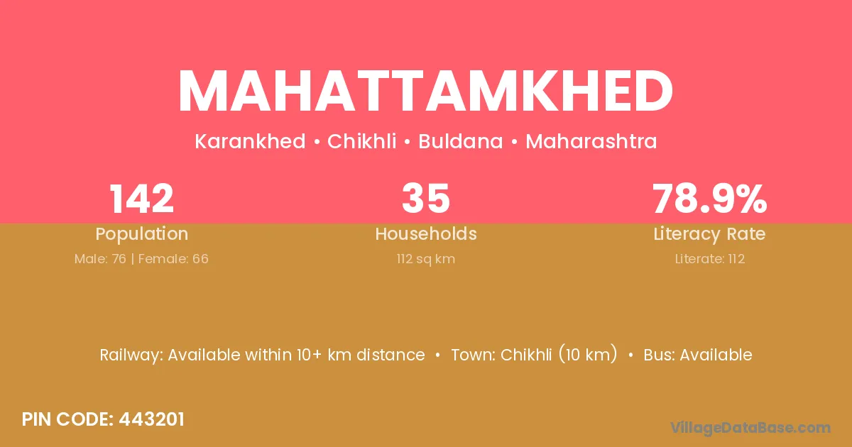 Chikhli (10 km) is the nearest town to Mahattamkhed village for major economic activities and is located approximately 10 km away.