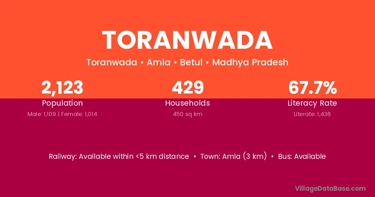 Toranwada village has a total population of 1,357 people, of which 699 are males and 658 are females.