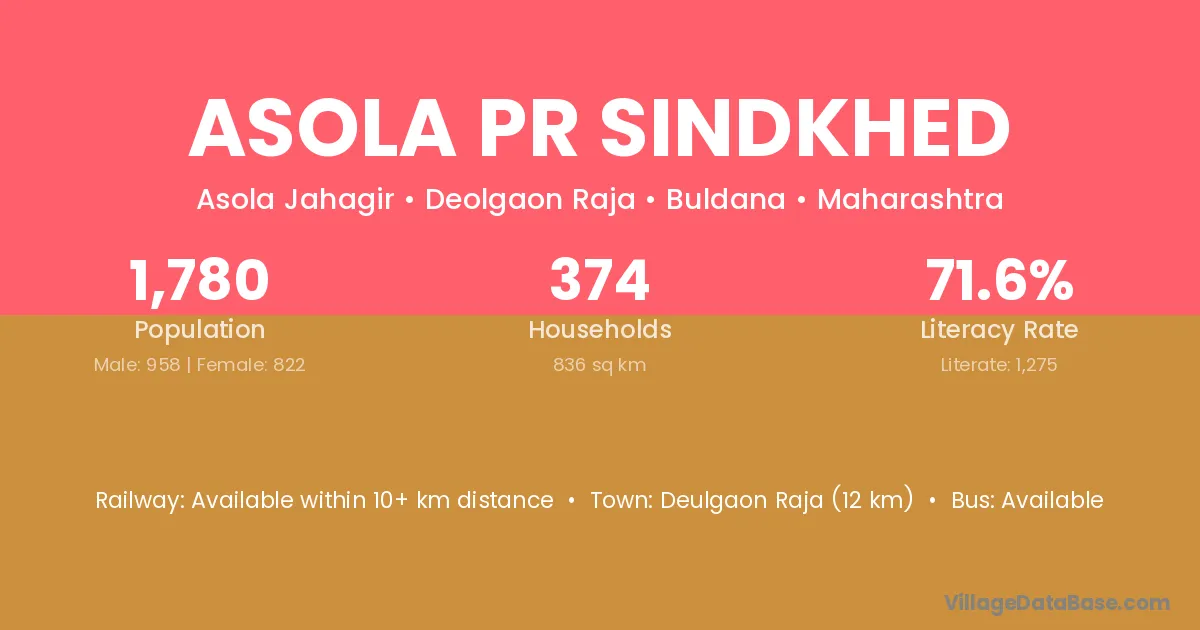 Deulgaon Raja (12 km) is the nearest town to Asola Pr Sindkhed village for major economic activities and is located approximately 12 km away.