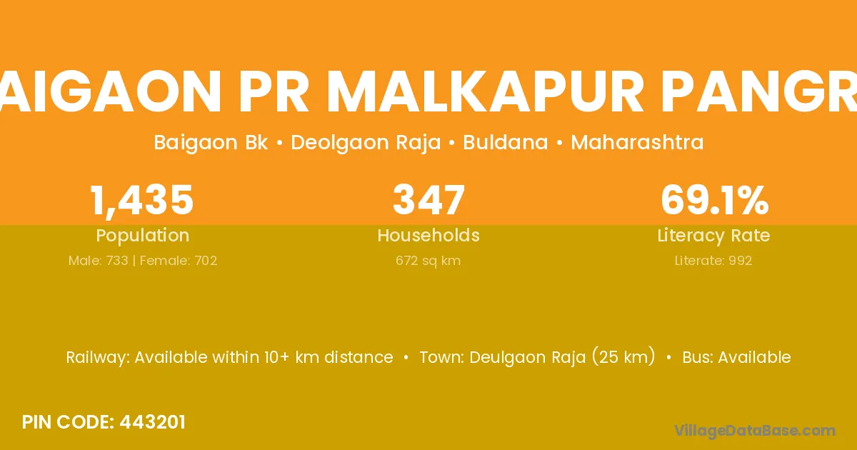 Deulgaon Raja (25 km) is the nearest town to Baigaon Pr Malkapur Pangra village for major economic activities and is located approximately 25 km away.