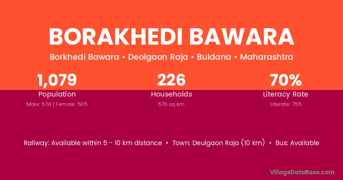 Deulgaon Raja (10 km) is the nearest town to Borakhedi Bawara village for major economic activities and is located approximately 10 km away.