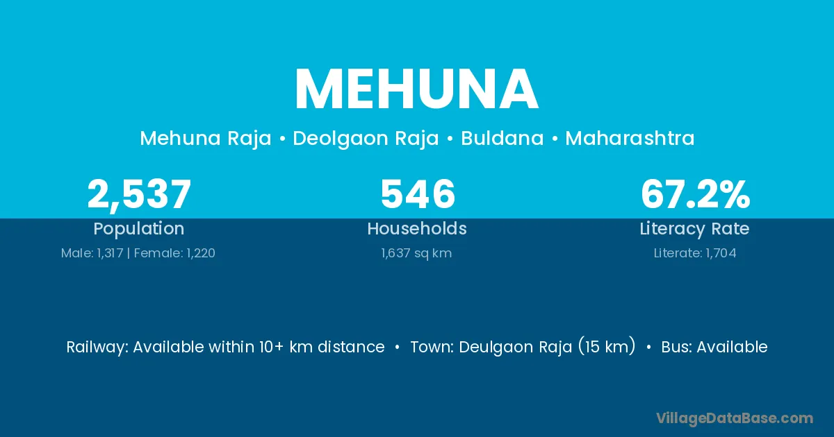Deulgaon Raja (15 km) is the nearest town to Mehuna village for major economic activities and is located approximately 15 km away.