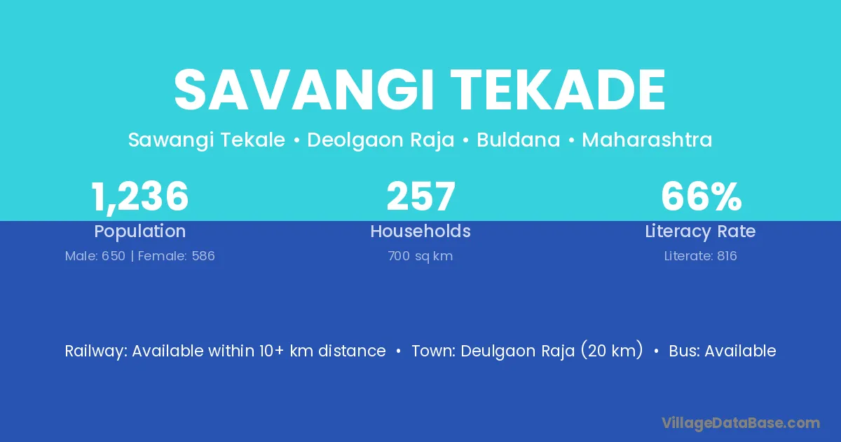 Savangi Tekade village has a total population of 1,236 people, of which 650 are males and 586 are females.