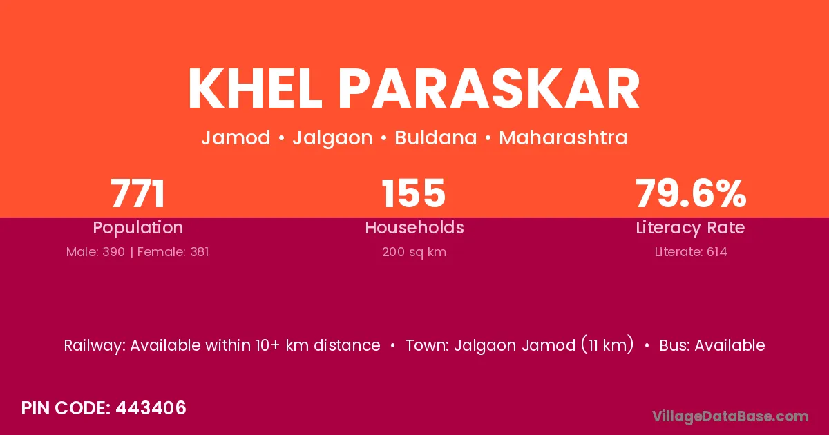 Jalgaon Jamod (11 km) is the nearest town to Khel Paraskar village for major economic activities and is located approximately 11 km away.