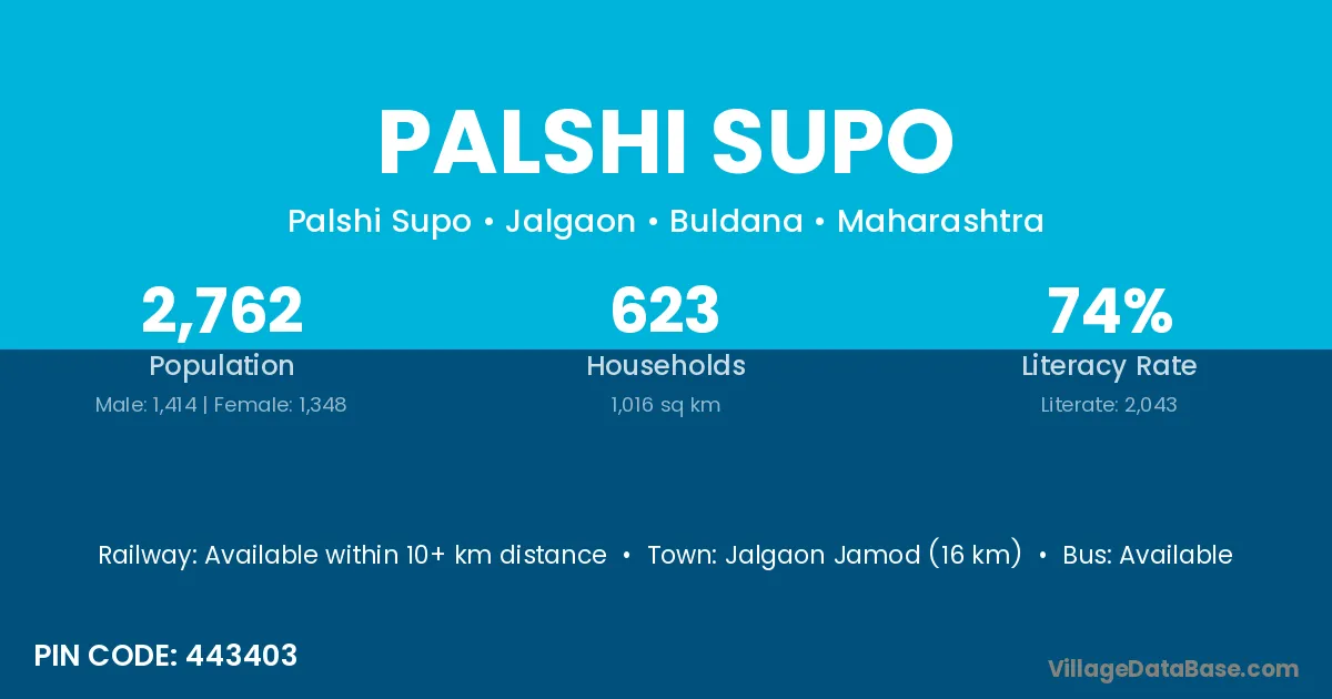 Jalgaon Jamod (16 km) is the nearest town to Palshi Supo village for major economic activities and is located approximately 16 km away.