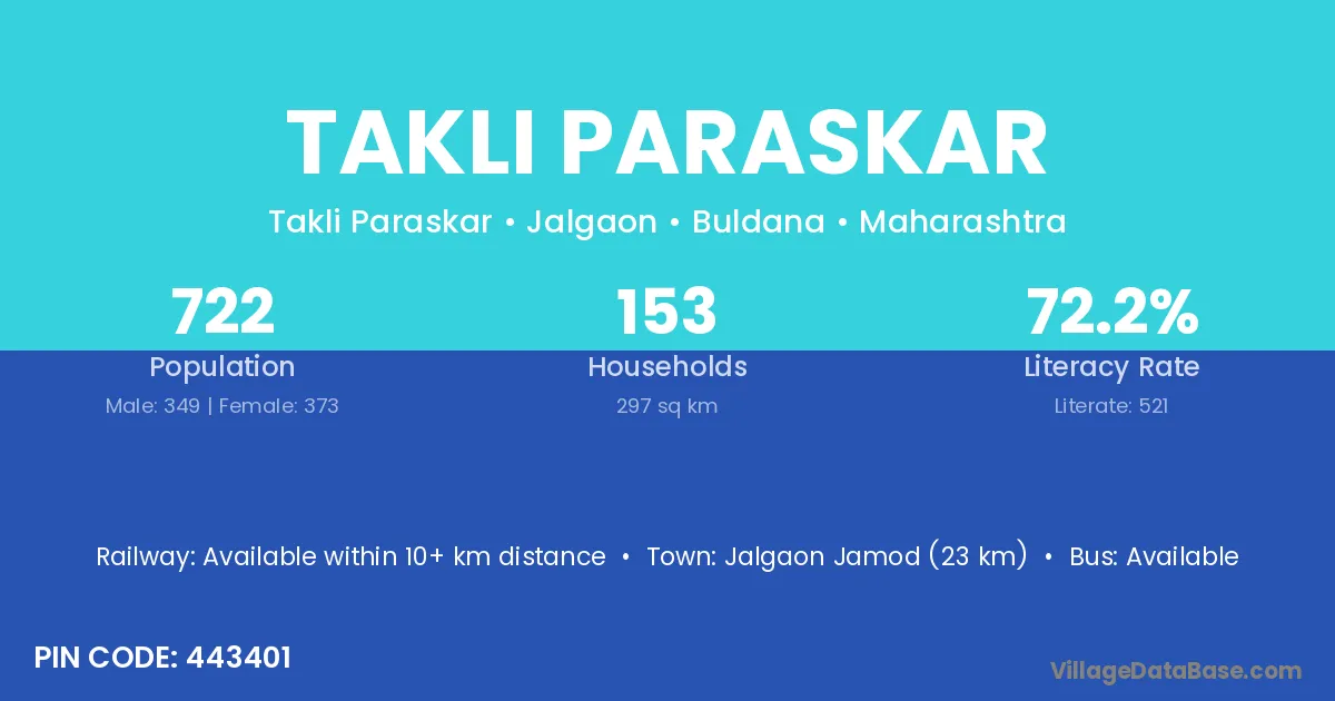 Jalgaon Jamod (23 km) is the nearest town to Takli Paraskar village for major economic activities and is located approximately 23 km away.