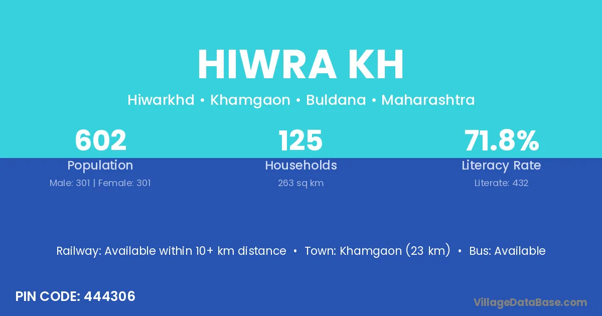 Hiwra Kh village has a total population of 602 people, of which 301 are males and 301 are females.