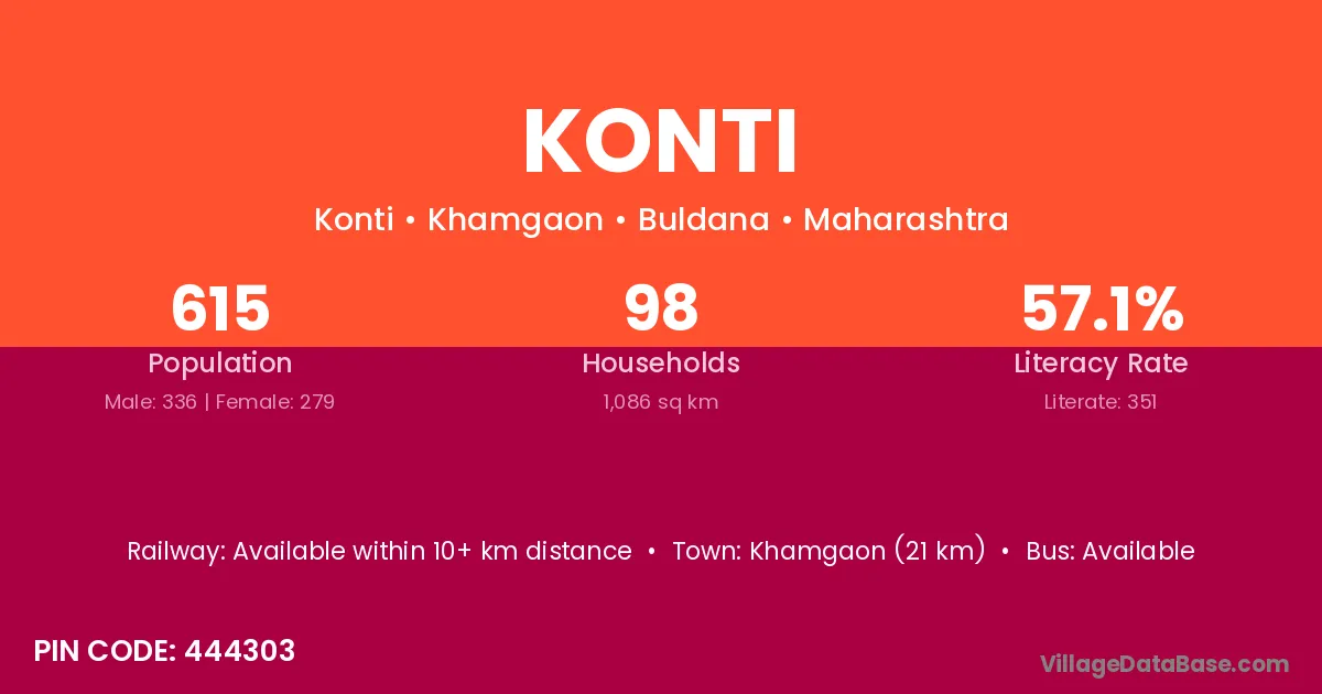 Khamgaon (21 km) is the nearest town to Konti village for major economic activities and is located approximately 21 km away.