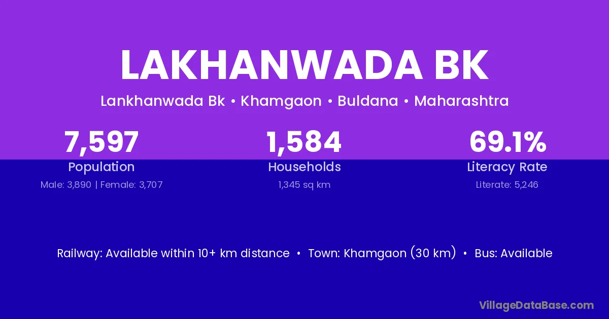Khamgaon (30 km) is the nearest town to Lakhanwada Bk village for major economic activities and is located approximately 30 km away.