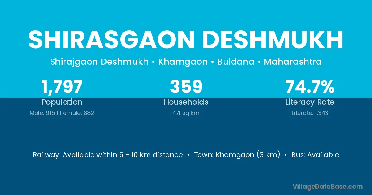 Khamgaon (3 km) is the nearest town to Shirasgaon Deshmukh village for major economic activities and is located approximately 3 km away.