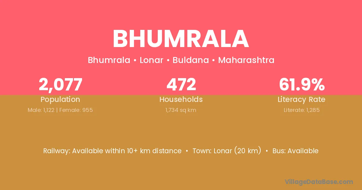 Lonar (20 km) is the nearest town to Bhumrala village for major economic activities and is located approximately 20 km away.