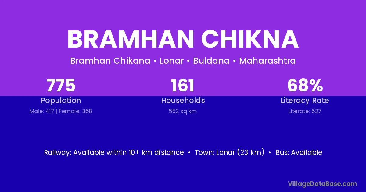 Lonar (23 km) is the nearest town to Bramhan Chikna village for major economic activities and is located approximately 23 km away.