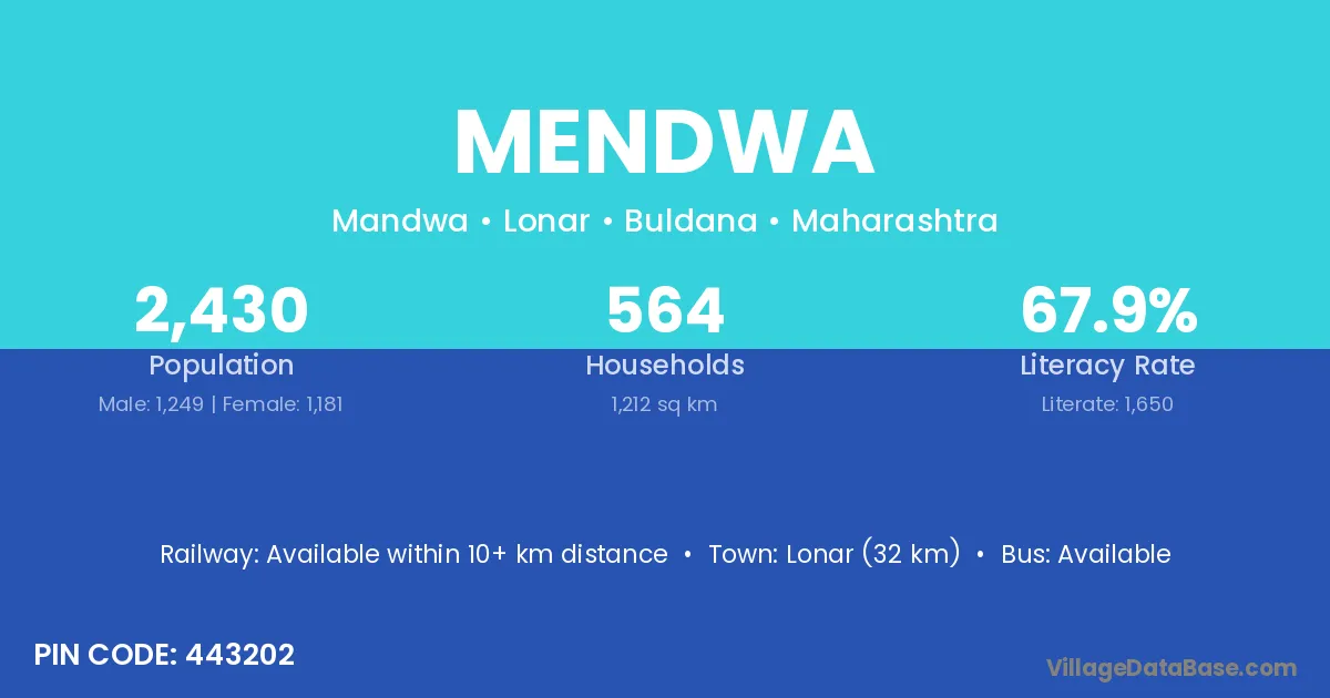 Lonar (32 km) is the nearest town to Mendwa village for major economic activities and is located approximately 32 km away.