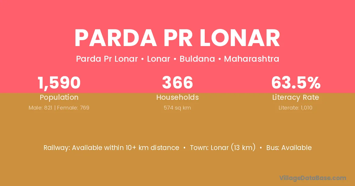 Lonar (13 km) is the nearest town to Parda Pr Lonar village for major economic activities and is located approximately 13 km away.