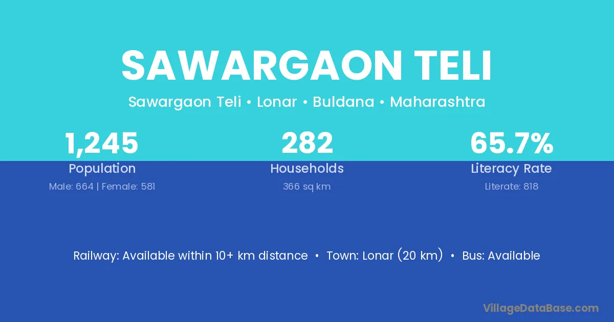 Lonar (20 km) is the nearest town to Sawargaon Teli village for major economic activities and is located approximately 20 km away.