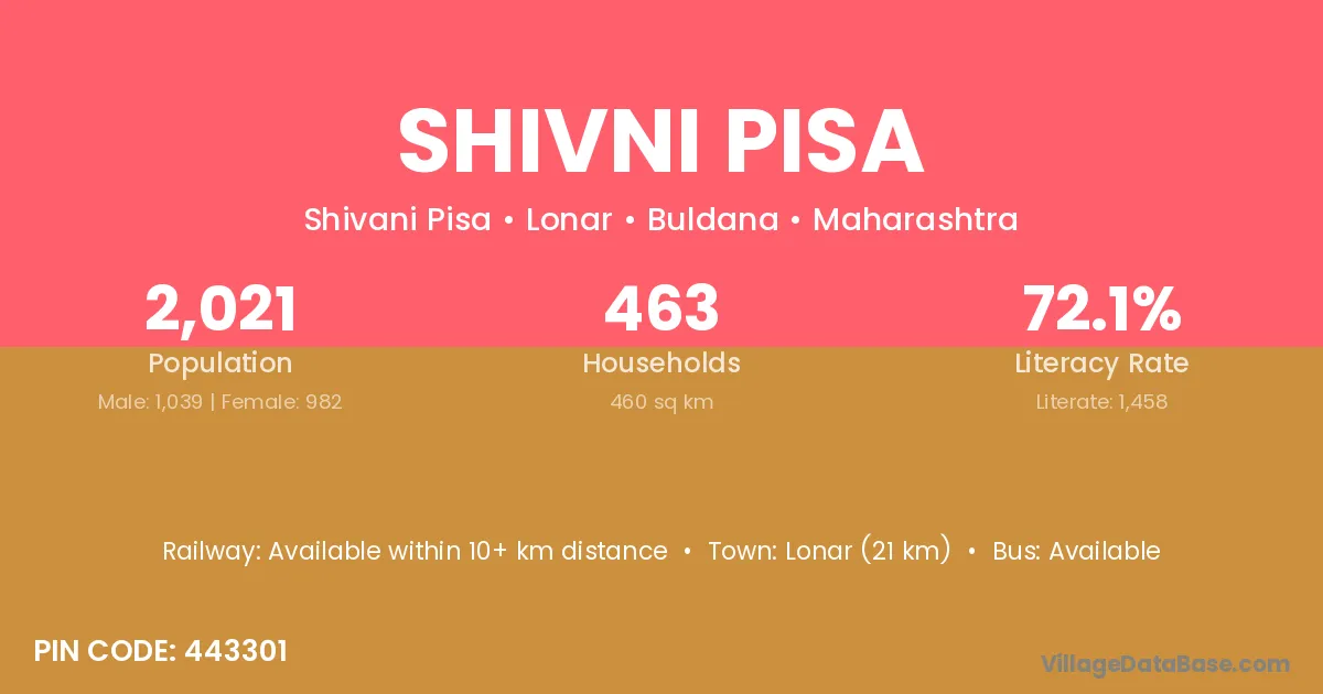 Lonar (21 km) is the nearest town to Shivni Pisa village for major economic activities and is located approximately 21 km away.