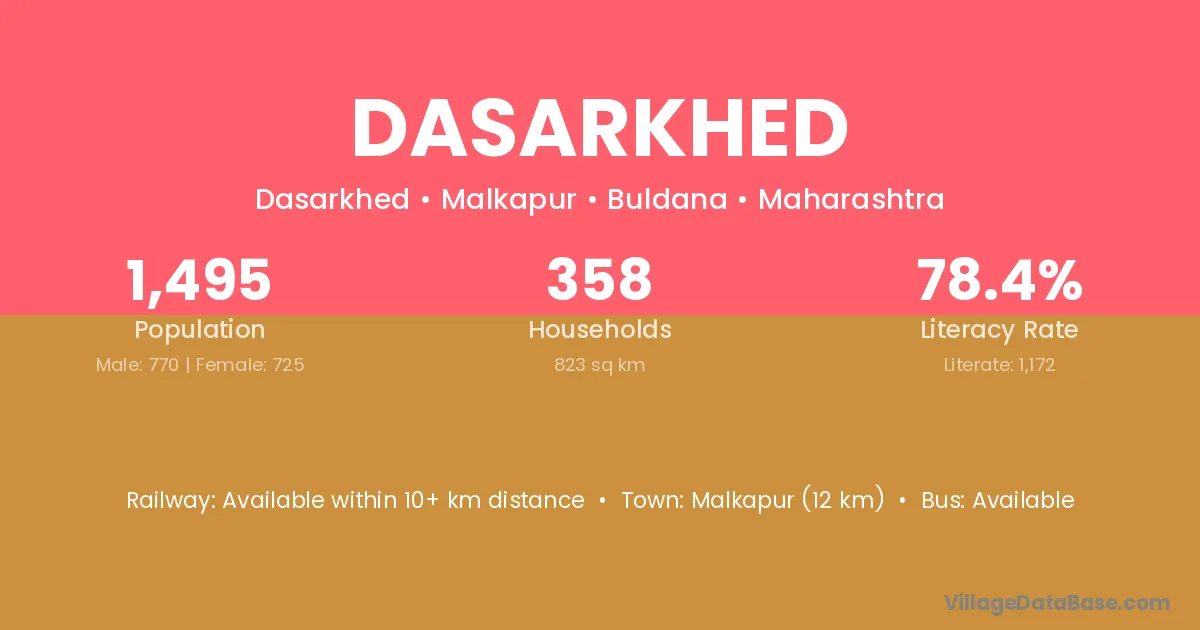 Dasarkhed village has a total population of 1,495 people, of which 770 are males and 725 are females.
