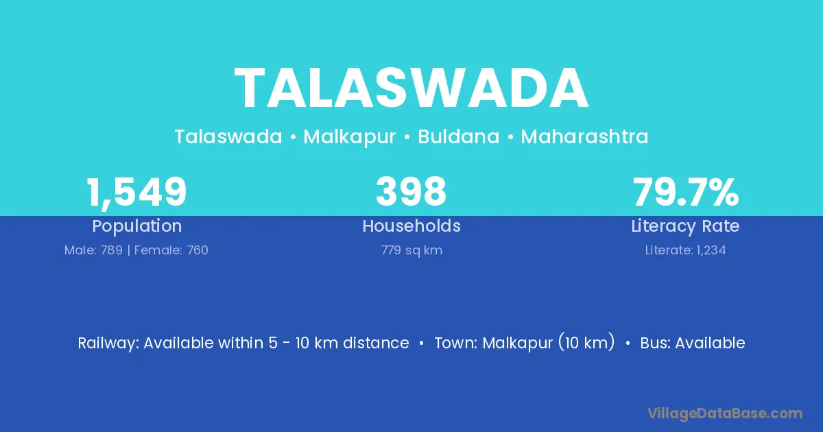 Malkapur (10 km) is the nearest town to Talaswada village for major economic activities and is located approximately 10 km away.