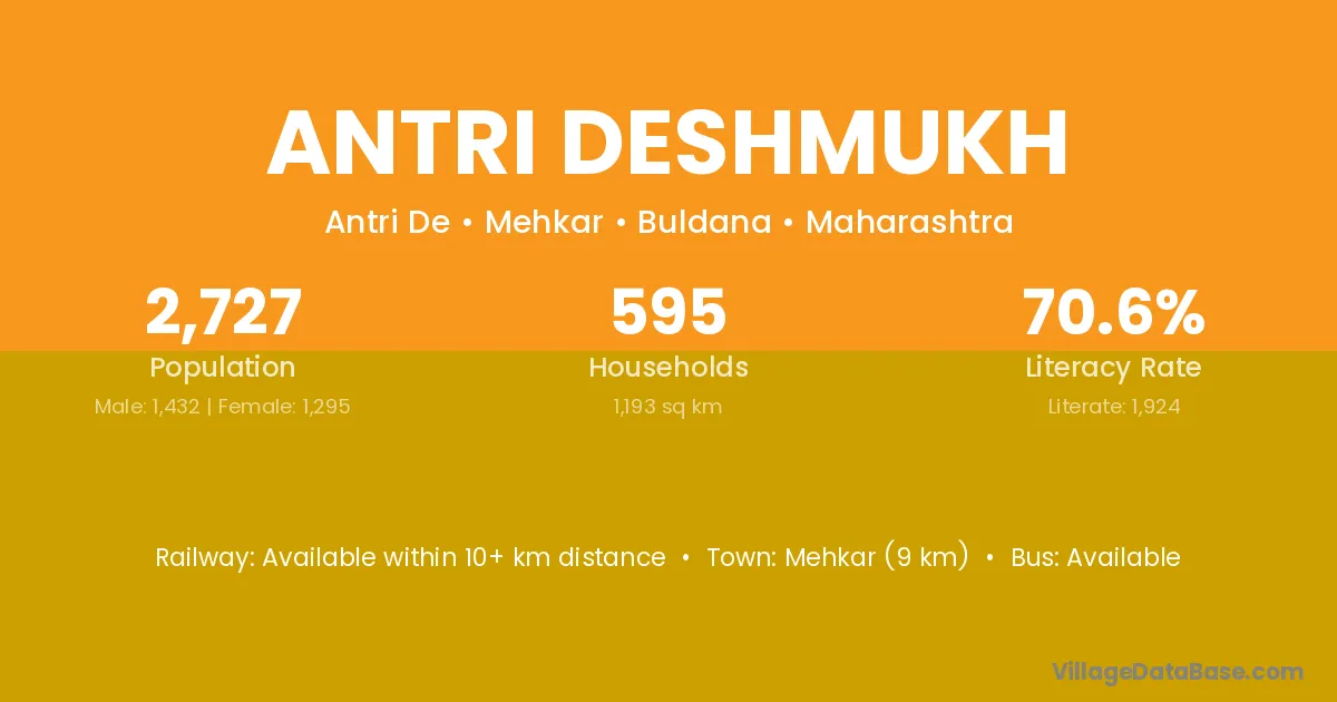 Mehkar (9 km) is the nearest town to Antri Deshmukh village for major economic activities and is located approximately 9 km away.
